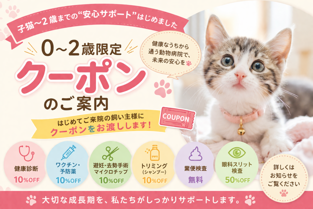 そこで当院では、0~2歳の猫ちゃん向けのクーポンをご用意しました。