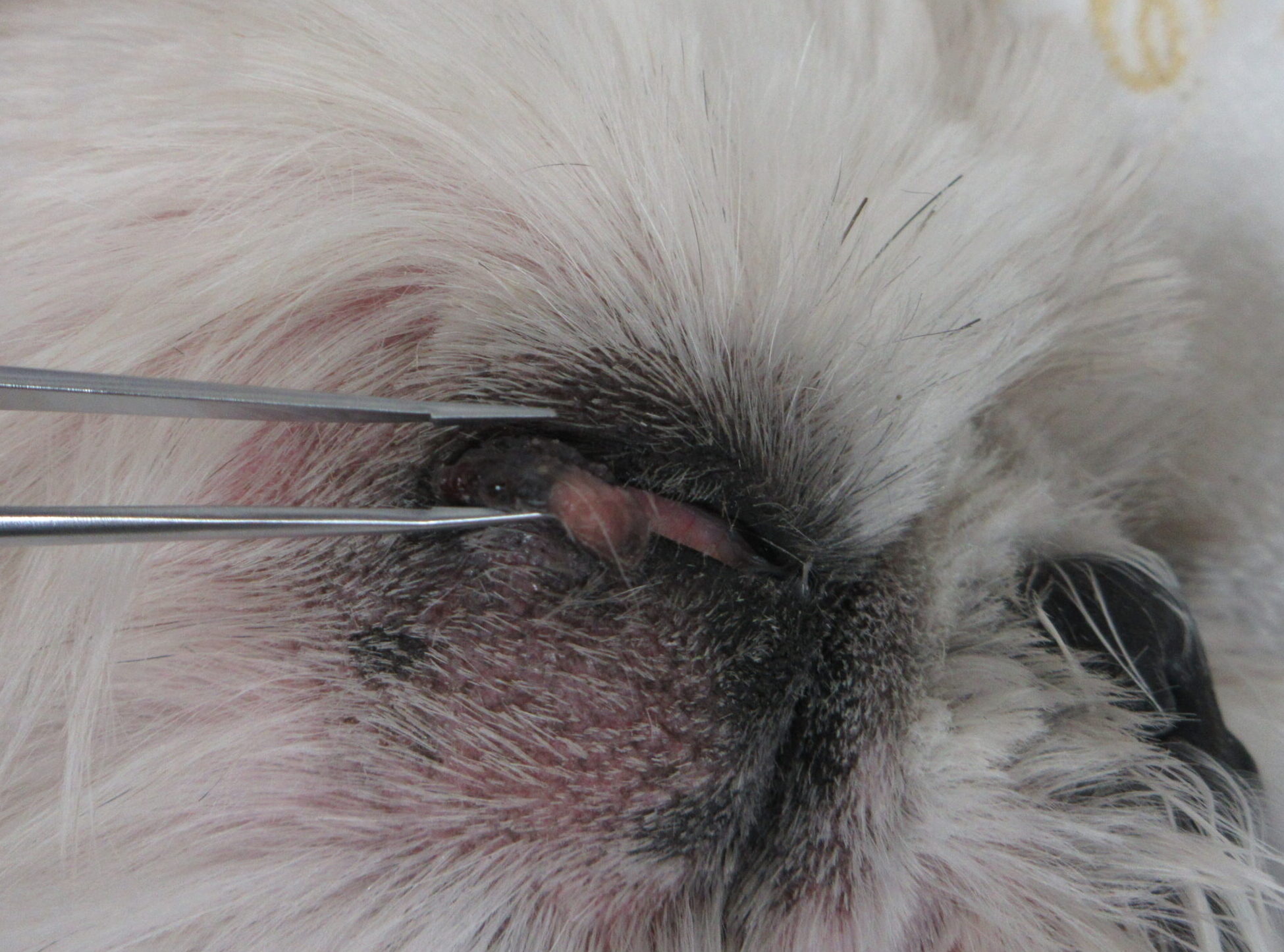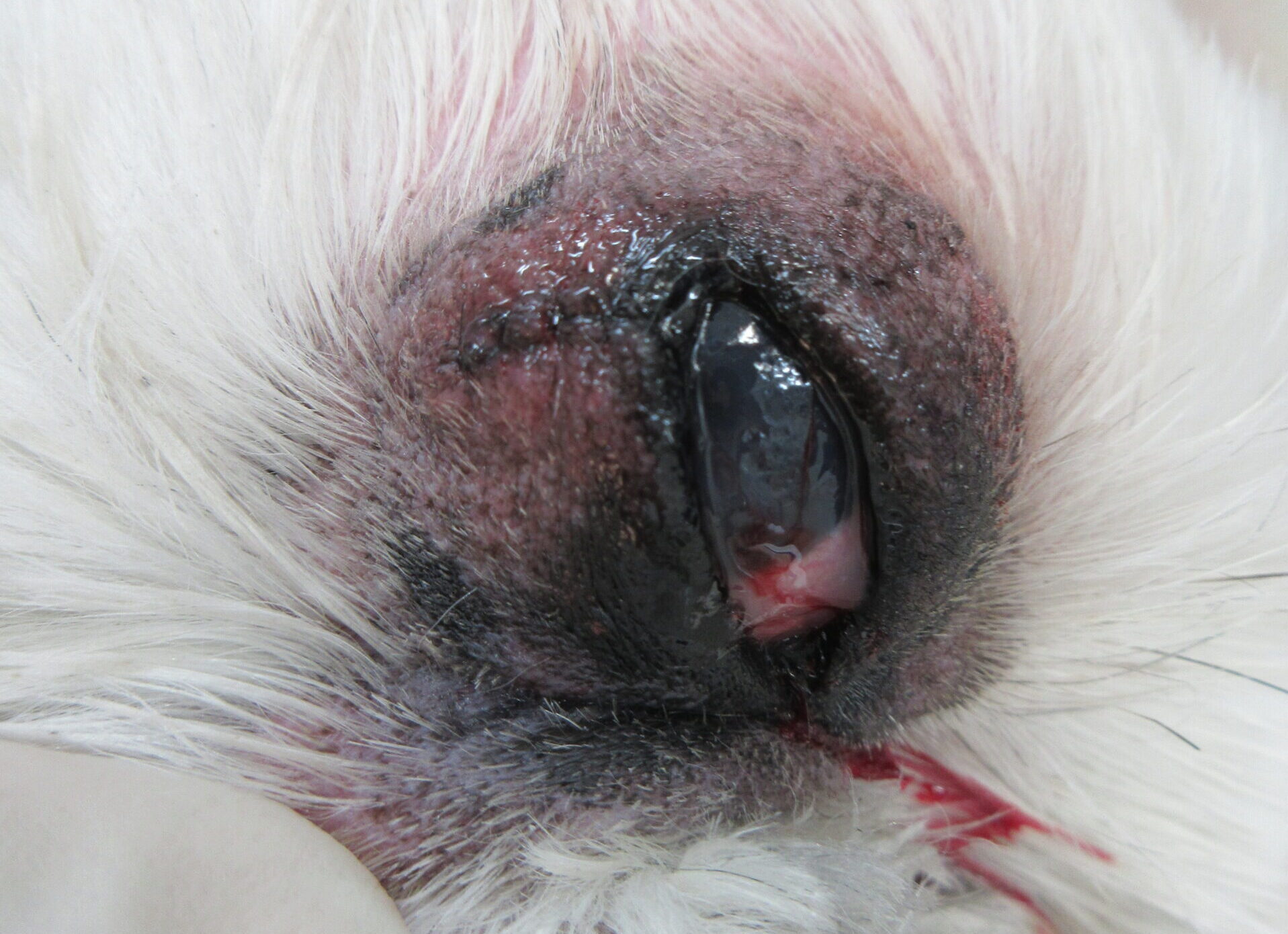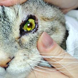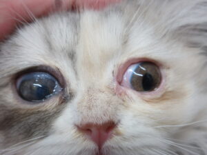 慢性的な刺激やヘルペスウイルス感染により角膜が黒く壊死・変色し、強い痛みを伴う特有の眼疾患です。放置すると角膜穿孔(穴が開く)のリスクもあります。好発猫種はペルシャ、ヒマラヤン、シャムです。治療には外科的な表層角膜切除術(壊死組織の切除)後に角膜移植や結膜移植を行います。内科的には点眼・投薬治療が行われます。