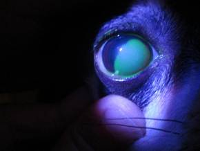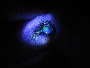 角膜染色検査を行うと、傷の部分が緑色に染まります。